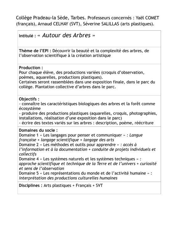 -« améliorer le partenariat avec le monde professionnel » (découverte des métiers autour de la forêt: ONF…). -« encourager l’accès des jeunes à la culture et aux arts… ». En lien avec l’axe « Un lieu de vie où chacun peut s’épanouir », cet EPI développe également les objectifs suivants: -« Encourager l'engagement des élèves dans les projets pédagogiques et projets de solidarité pour développer leur goût de l'effort, leur autonomie, leur sens de la responsabilité et de la solidarité. Rendre les élèves acteurs de leur projet. » "